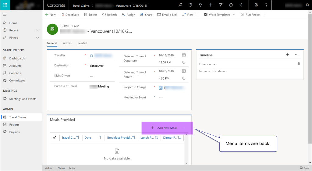 I created a new Unified Interface app for the Corporate group. I added the Travel Claim and Meal entities to the new solution. When I published the App, I noticed that I was missing the “+” button from the sub-grid. I have also noticed that on other custom entities I was missing the menu bar. Without that button, users are unable to add Meals to their Travel Claim.