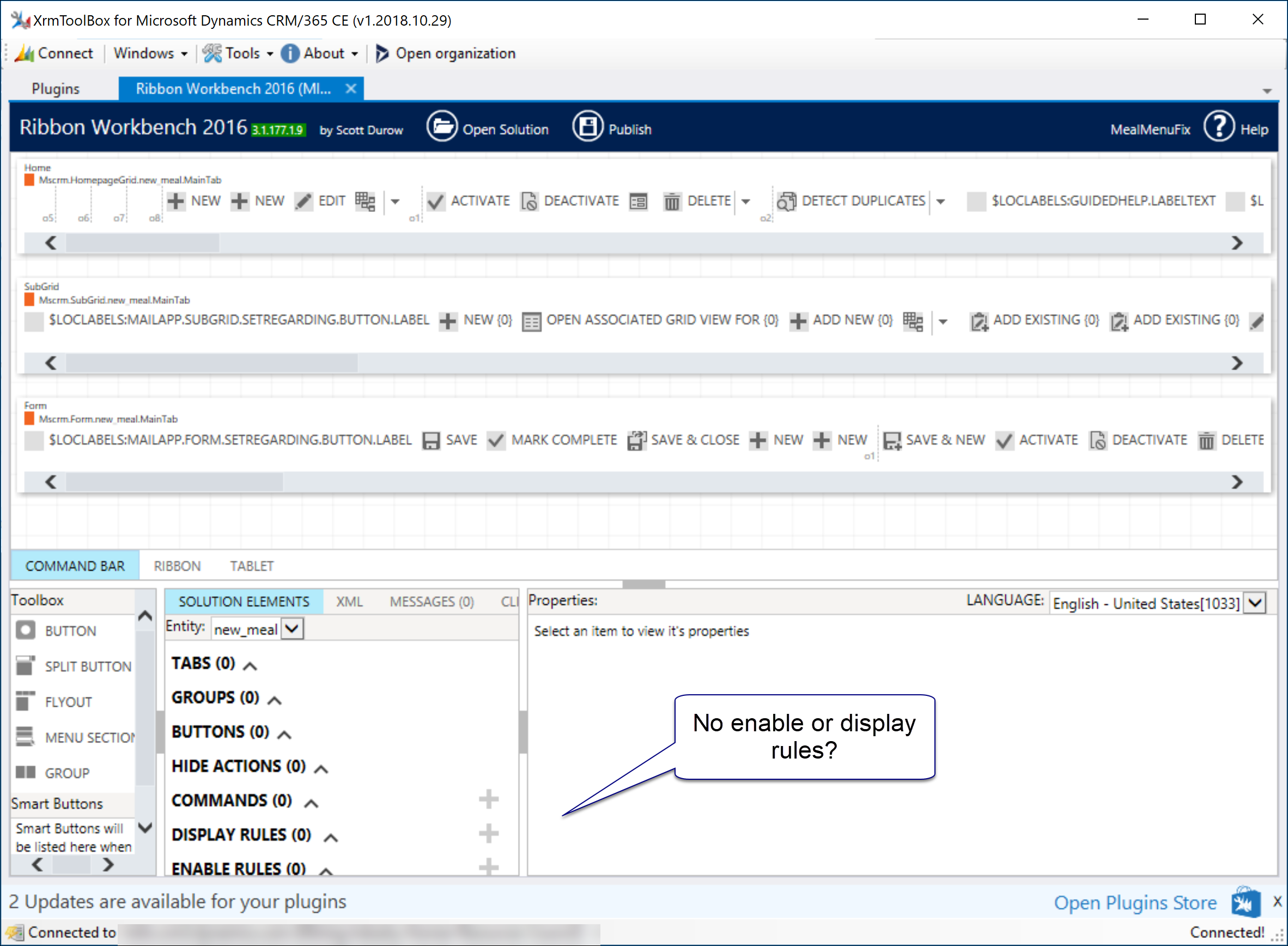 We finally can load the Ribbon Workbench in the XrmToolBox and load our solution. Notice that there are no “enable” or “display” rules applied to that entity.
