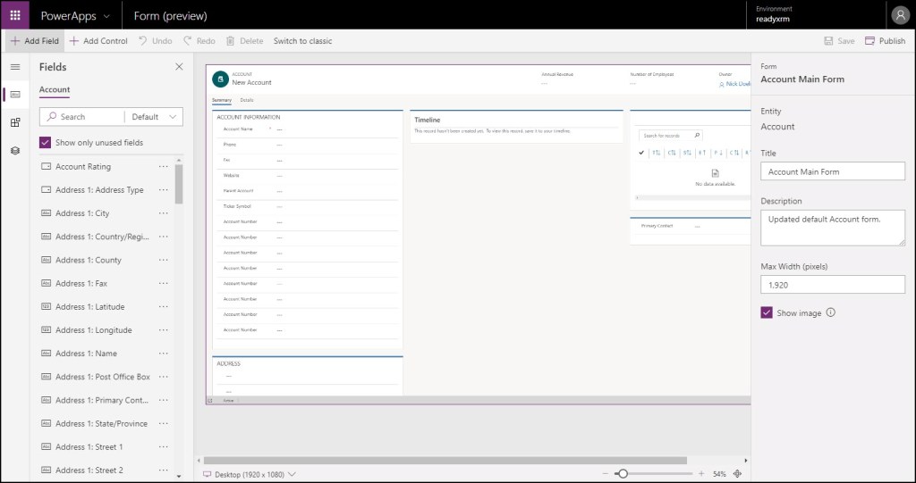 You cannot add or configure sub-grids (yet) and I also couldn’t find where to add JavaScript event handlers. While the classic editor did have a preview function, you can now easily see what your form will look like as well as flip to different resolutions and mobile and tablet modes.