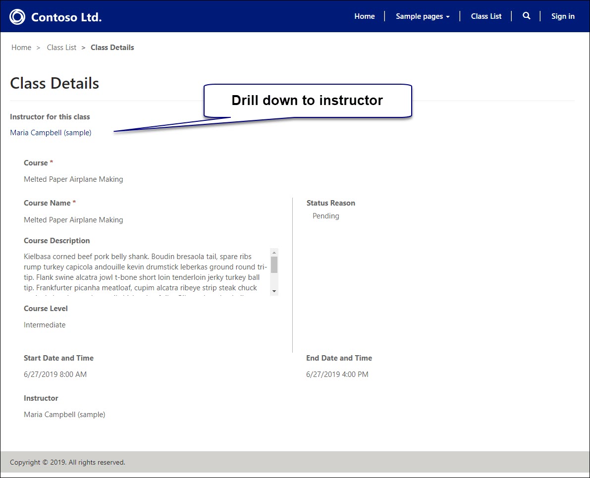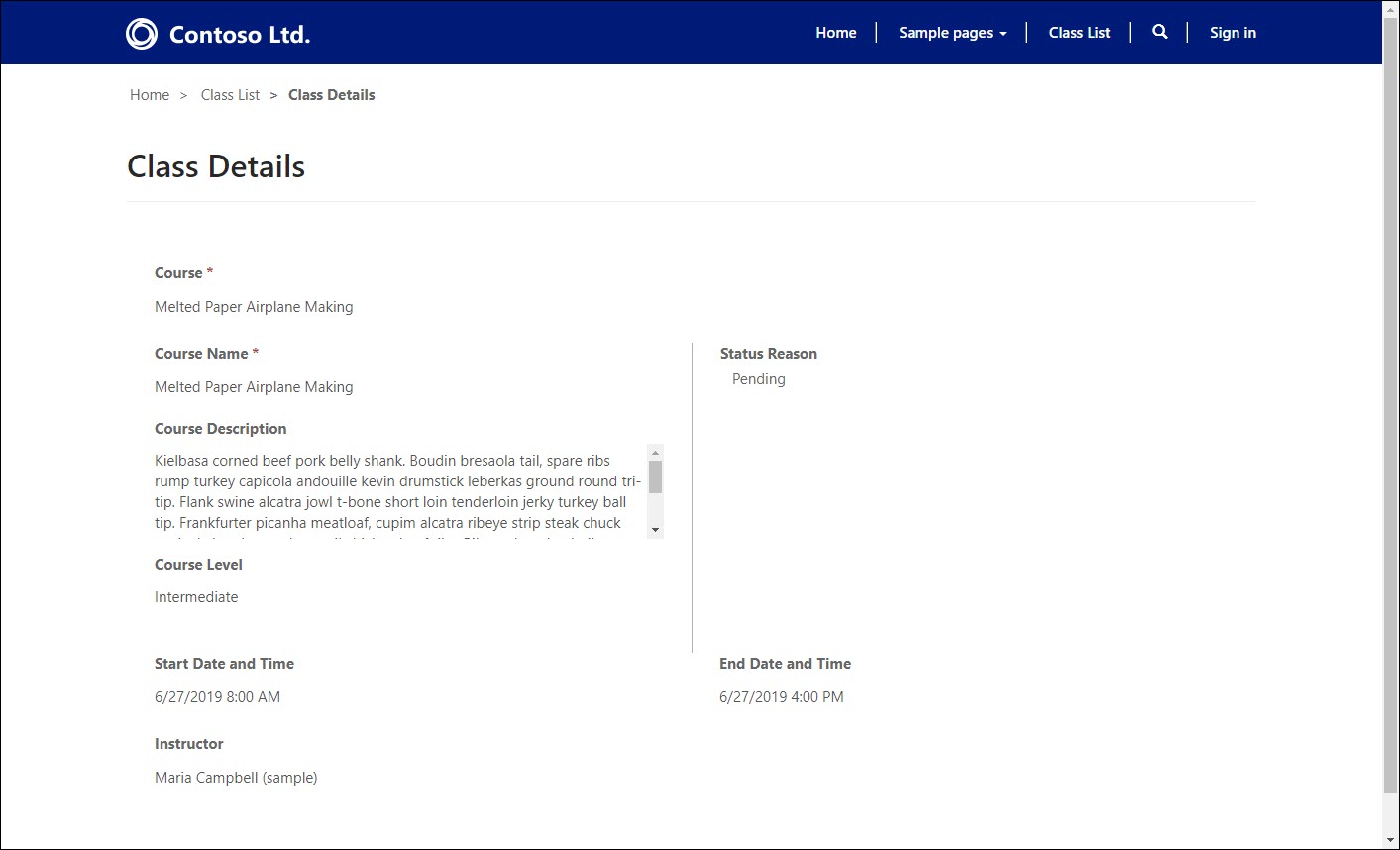 I have configured the Entity List to drill down on the details of the class. So far, all fairly straight forward features of PowerApps Portals.