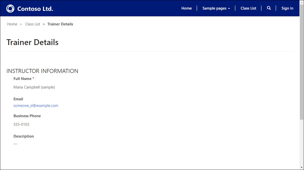 We would also create a web page and put the Instructor Entity form on this page. (Again, I used legacy front side editing tools, but soon we will be able to add components in the PowerApps maker experience site)