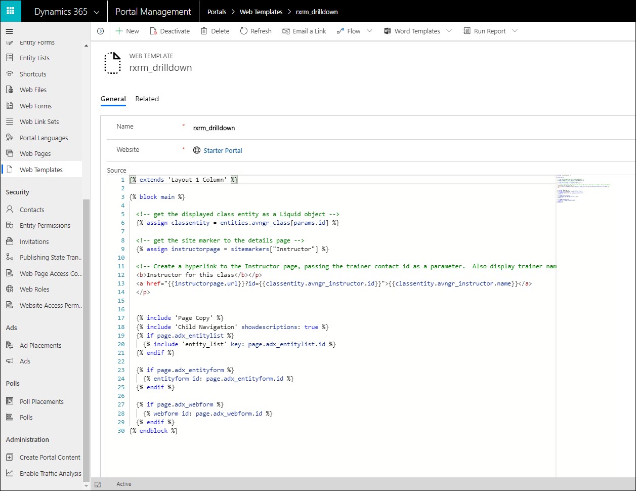 I then created a copy of the “Full Page” web template and added Liquid code. I will use this template on the “Class” entity form page in order to add the custom drilldown to the instructor. I could have also added the Liquid code to the web page content however I prefer to keep all the Liquid, JavaScript and CSS code in one spot.