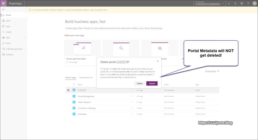 However, a pop-up will appear stating that while the portal and the URL will be not be accessible, it will not affect any portal configurations or solutions in your CDS environment.