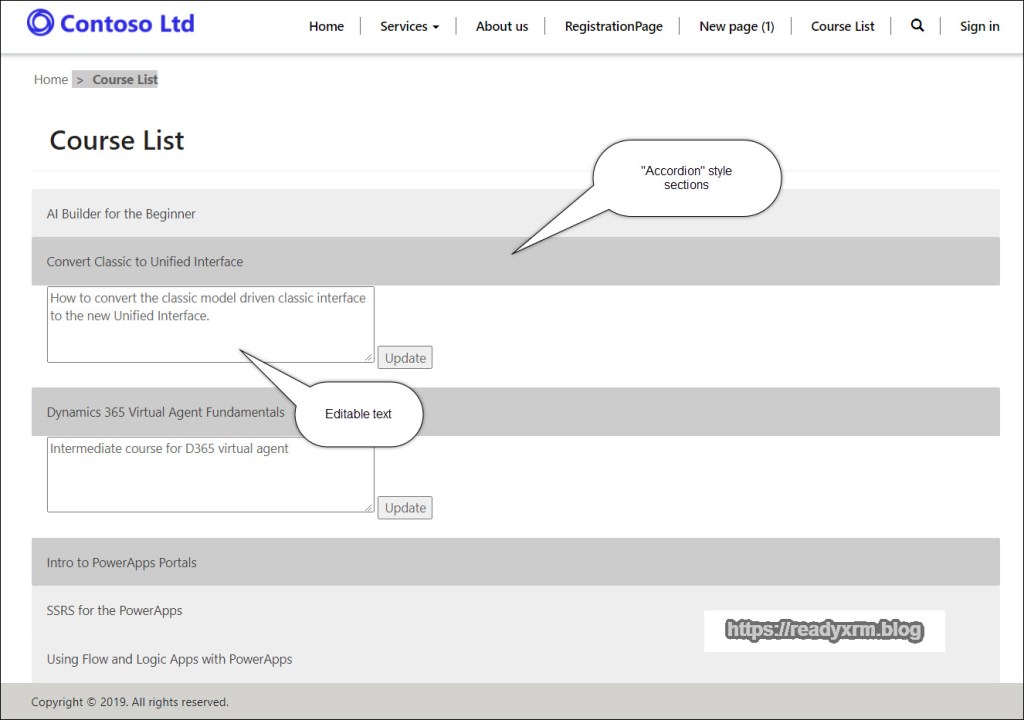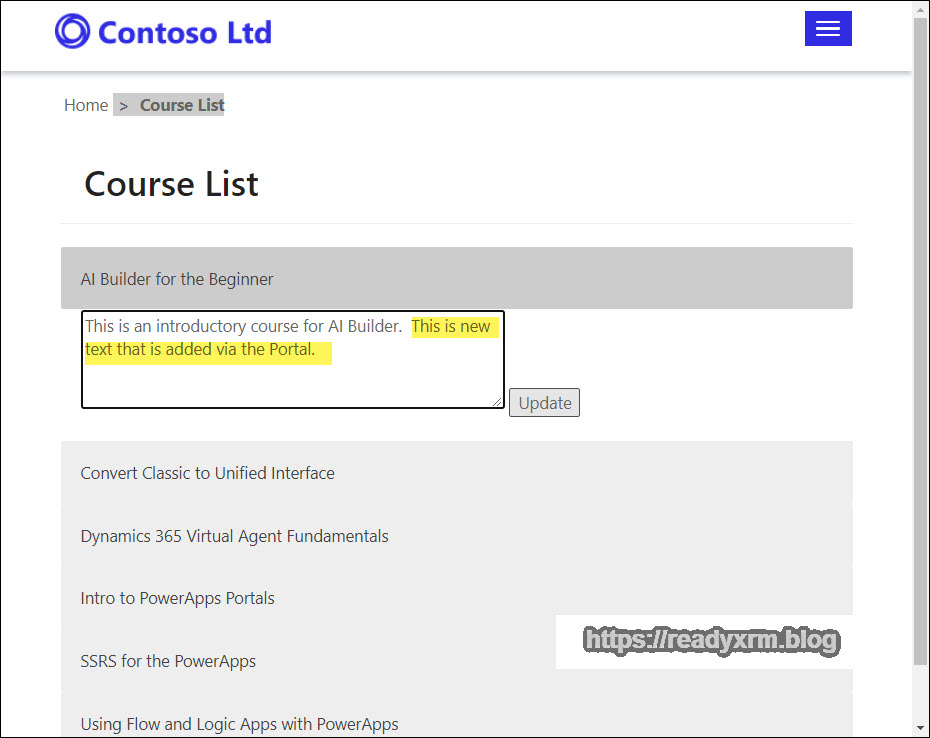 My example will list a series of courses and allow the portal user to update the description for each course without submitting a form. It might not be the most relevant use case, but hopefully will illustrate the process.