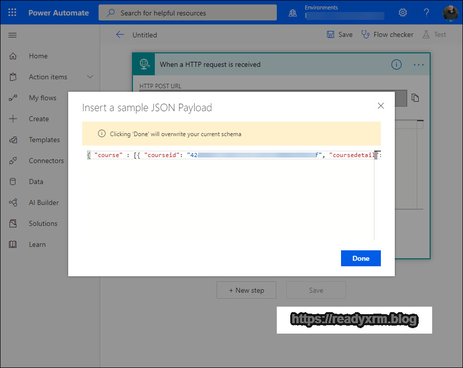 Once you have your sample, you can use that as a pattern for the Power Automate Http Request trigger by clicking the “Generate from sample” button;