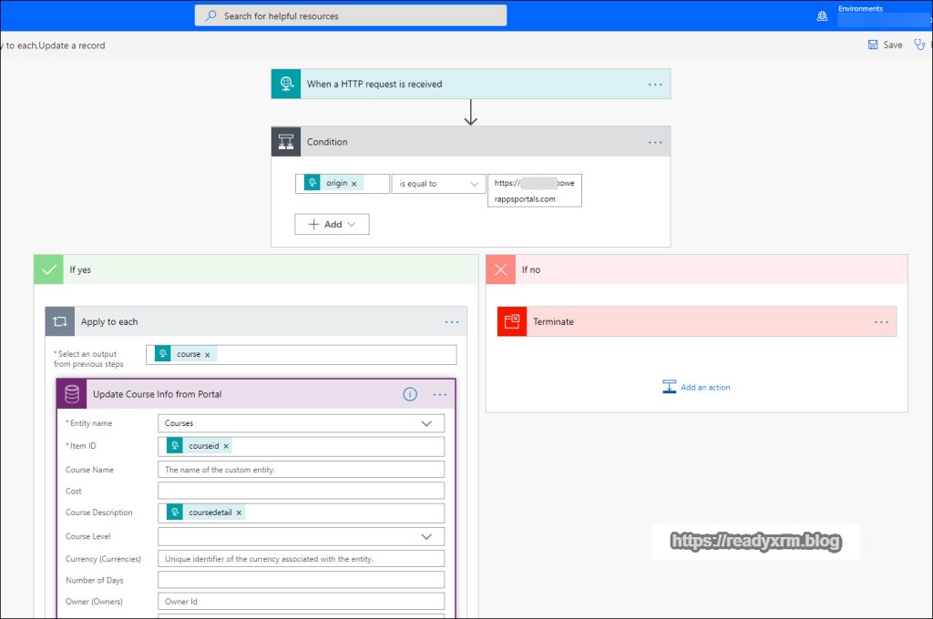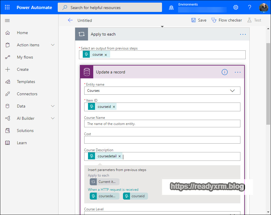 We have the “course id” and “course description” from our HTTP request trigger in our Power Automate flow. We can use these values to directly update a record in CDS/Dynamics 365.