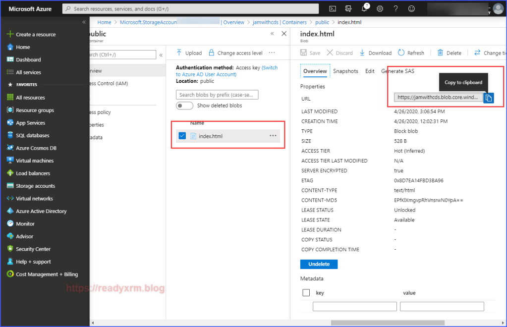 Test the flow and if successful, there should be a index.html file in the Azure blob. In the properties you will find the URL to browse to.