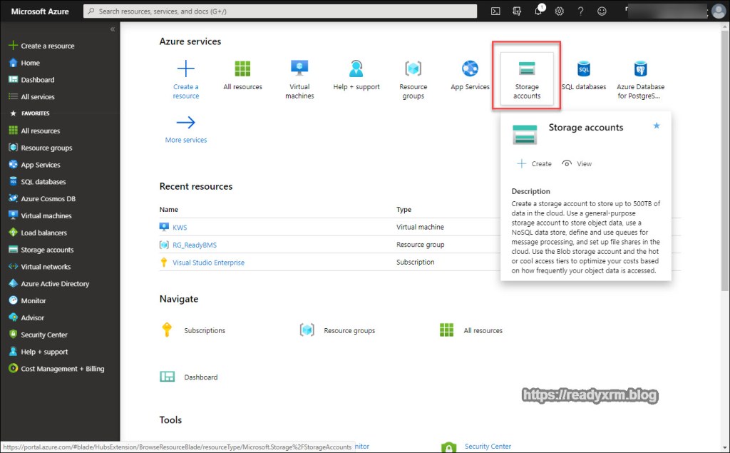 The first step is to create a new Azure Storage account. Locate the Storage accounts services on the Azure home page.