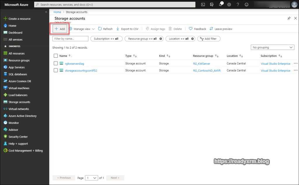 You will see a listing of your storage accounts, click on +Add to create a new storage account.