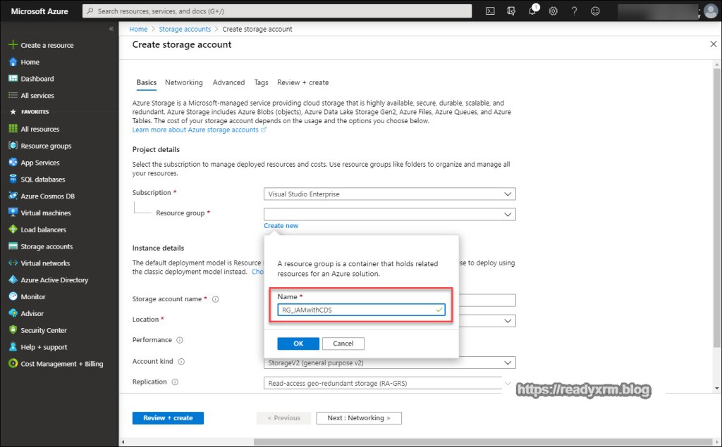 Choose a resource group to hold your storage account. I like to create new resource groups for each new project and I usually add a prefix of “RG” for easier visualization.