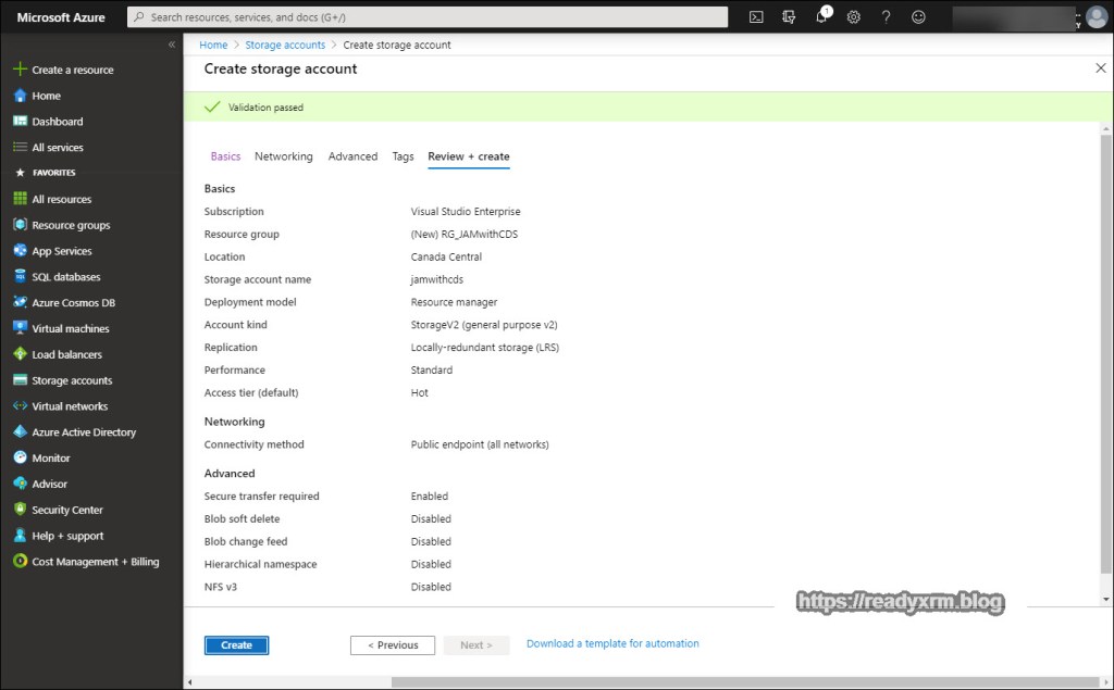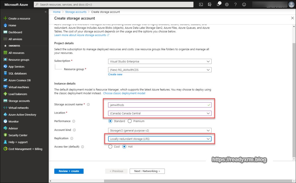 Give the storage account a name and ideally choose a data center. Usually I would recommend the same data center in which contains your Power Platform environment. This isn’t mission critical as there will be no “direct” connection between the web page and CDS. To save a few pennies, choose LRS storage, as our content is dynamically generated from CDS so we don’t need copies in different data centers. Click Review and Create.