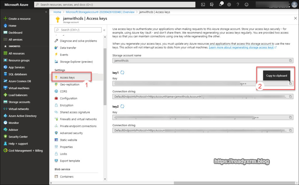 You will need an access key to allow access from Power Automate to update the web page content. In the settings tab, find Access keys and copy the key.