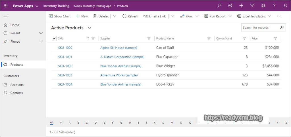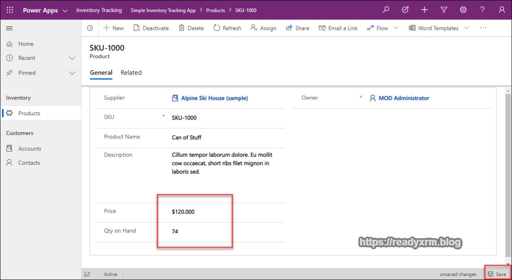 I created a very simple Power App (model driven) that tracks product inventory. This can be built on a vanilla CDS or extending the Dynamics 365 Sales product catalog.