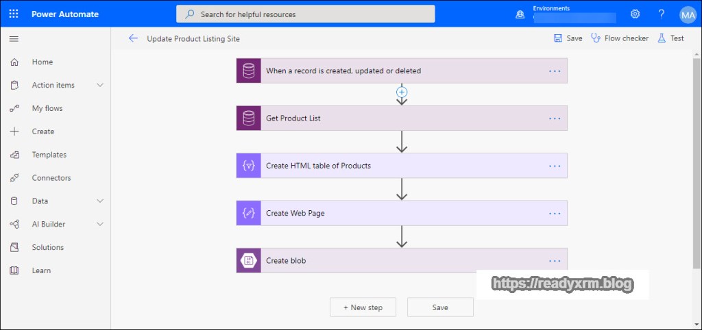 Instead of creating a complex web application with authenticated WebAPI calls to CDS to read records and format them into an HTML table, we will create a flow that will read data from CDS, format it as an HTML table, create a simple web page and copy it to Azure Blob storage.