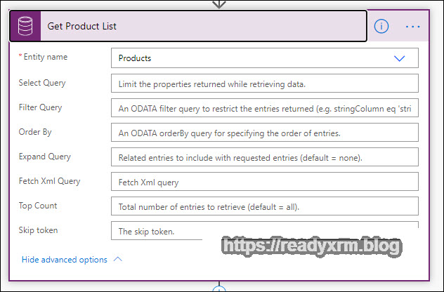 The next step is to collect the list of Product records from CDS using the Common Data Service (current environment) List records action.