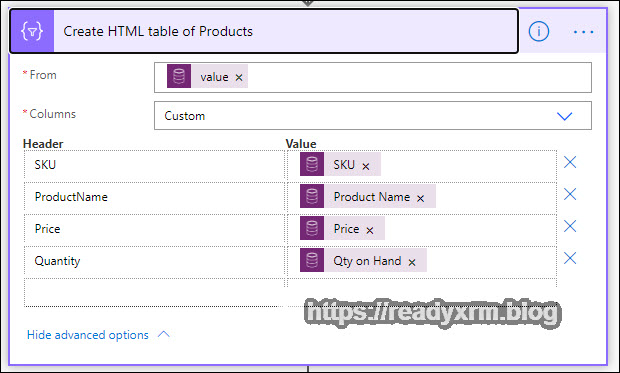 Now that we have our list of products, we can create an HTML table using the Data Operation Create HTML table action.