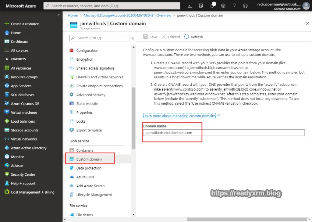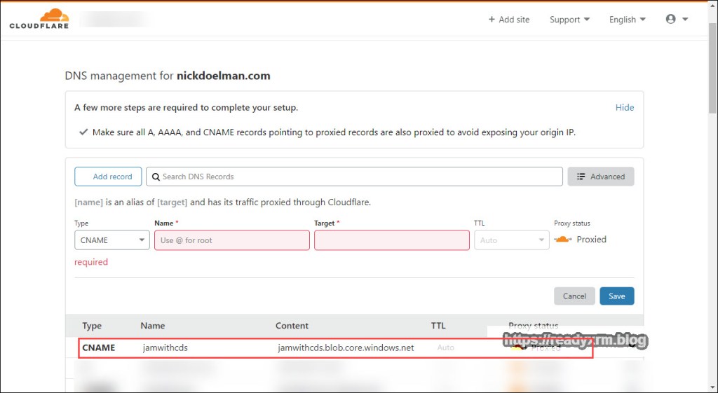 I signed up for free CloudFlare account and associated my nickdoelman.com domain name. I added a CNAME record pointing to my Azure blob storage URL.