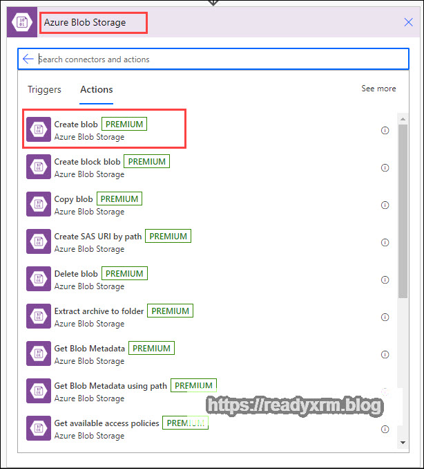 Now that our page is created, the next step is to create it as a file on the Azure Blob storage folder. Add the Azure Blob Storage Create blob action.