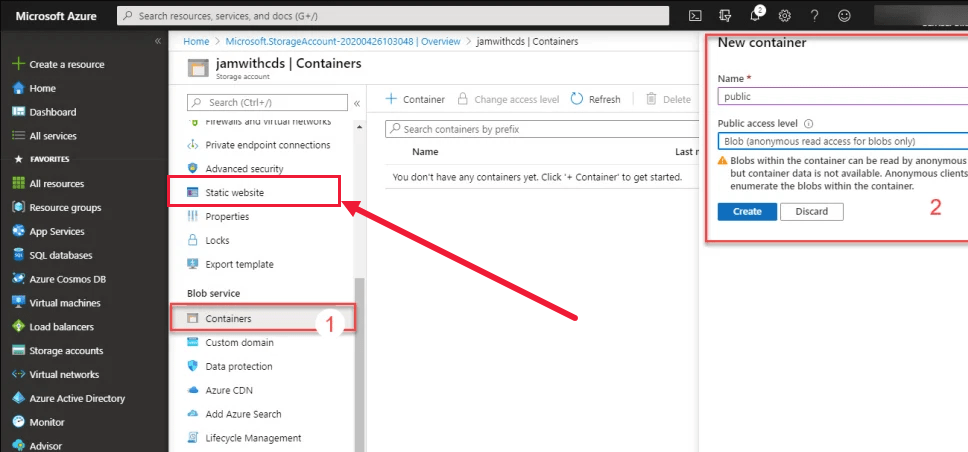 We now need to create the container within the storage account to hold the static web page. Locate the Containers tab and choose to create a new container. Choose a name for the container (this will be part of the URL, so keep it short and simple). Also provide blob anonymous read access to allow the world to read your web page.
