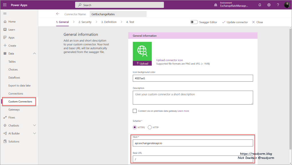 From the Power Apps maker portal, ideally in a solution, create a new Custom Connector from blank. Give the connector a name and put in the Exchange Rate API URL (api.exchangeratesapi.io) in the host field.