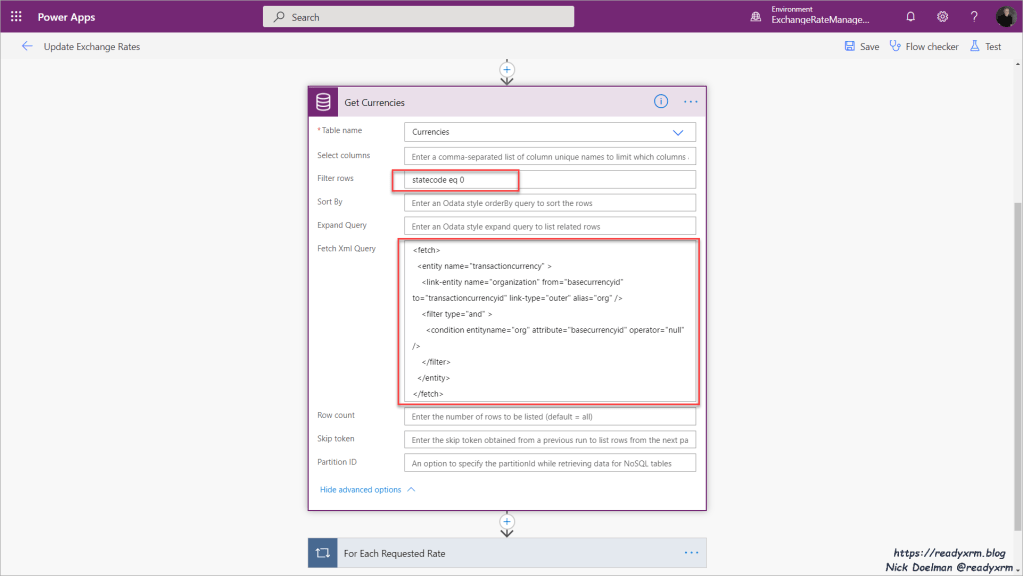 And here is the step to retrieve currencies from Dataverse using that FetchXML.