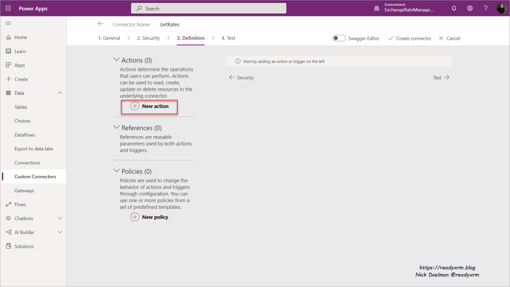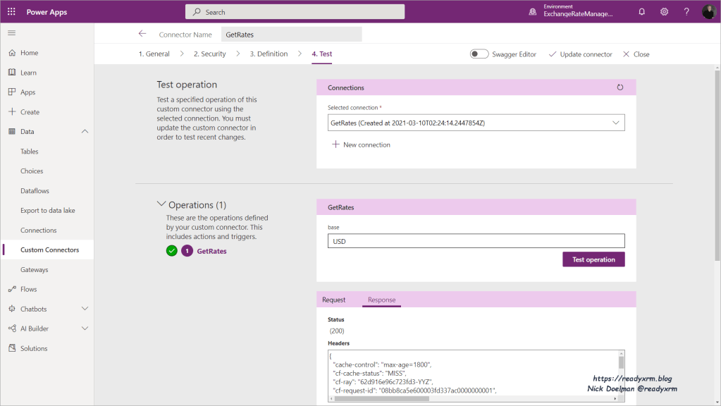 The next step is to create a custom connector using this API. Again, I followed the instructions on Ryan’s blog post to create a custom connector for this API.