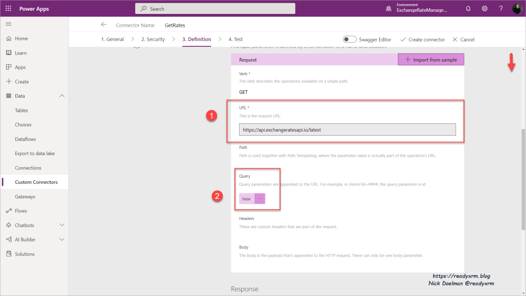 We will have the GET request URL and the Query (base currency) defined in our custom connector.