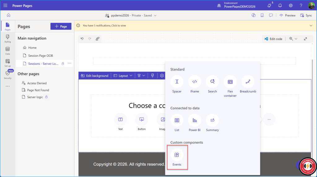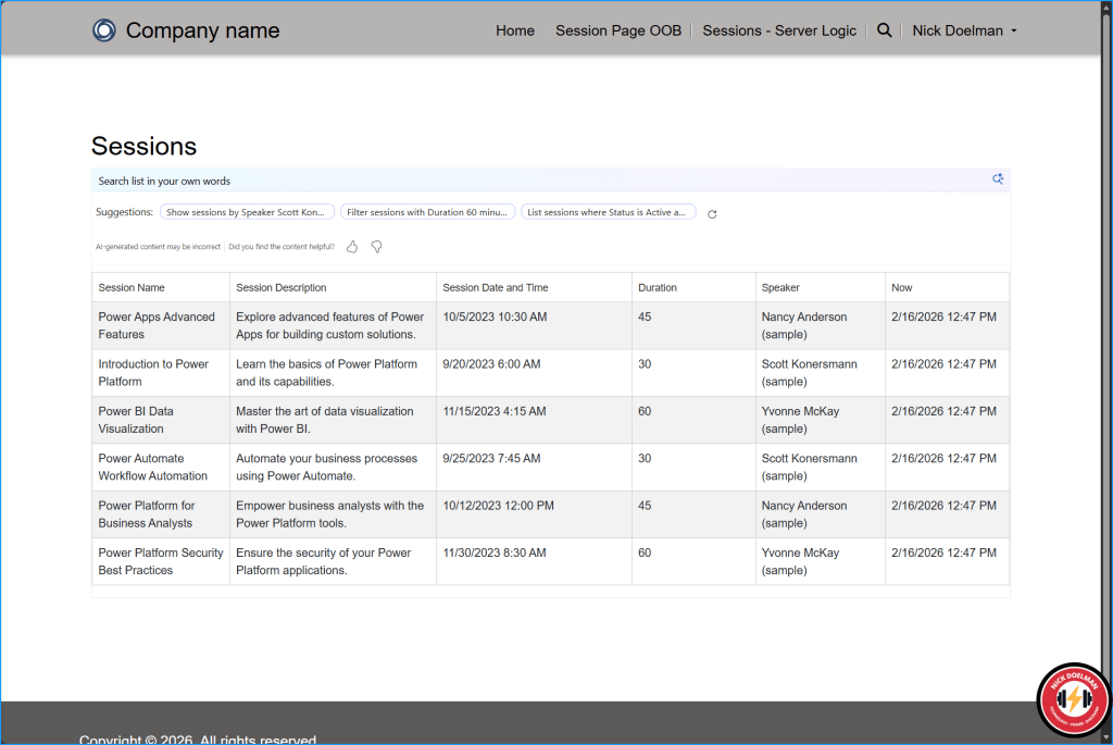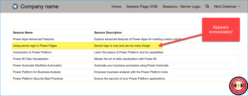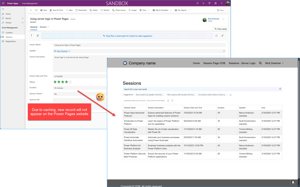 If I go into my model-driven Power App and create a new session, that session will not appear on the Power Pages website for at least 5-15 minutes. This may not be a big deal, but in some cases where timing is important, we’d want to be able to see the latest info immediately!