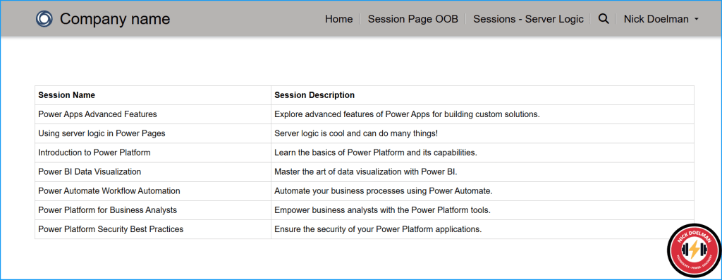 For example, here is a simple website with a list control pointing to a Dataverse table called “Sessions”: