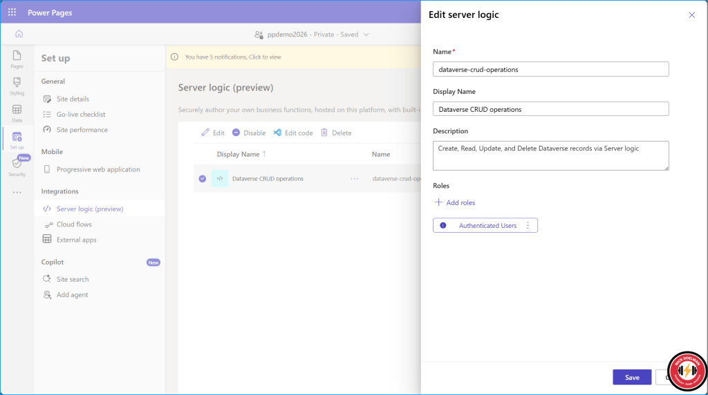 In the Power Pages design studio, in the Setup workspace, create a new server logic entry. You will also need to identify the webroles of users that will have access to the server logic.