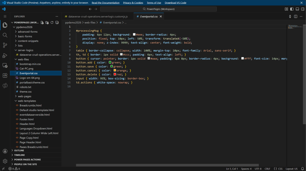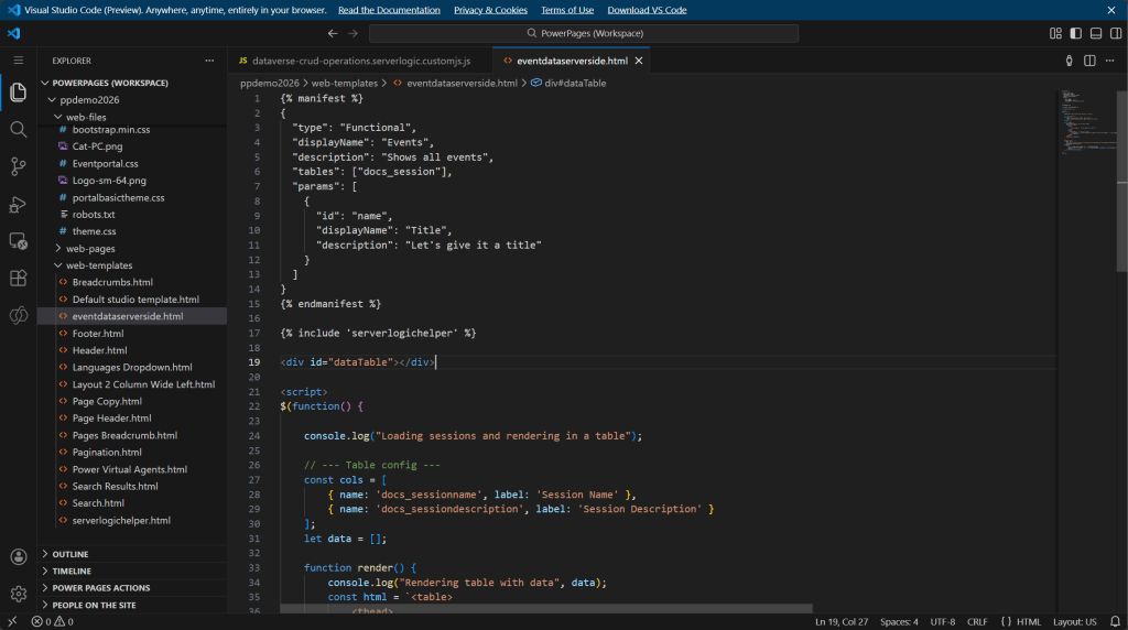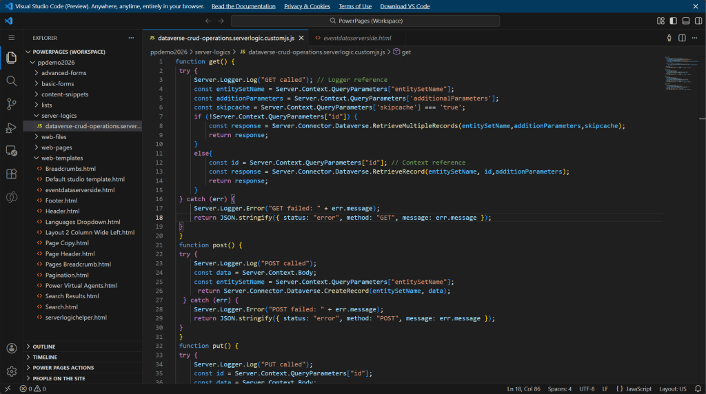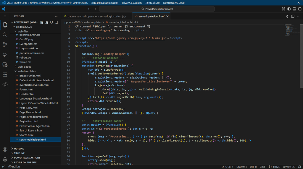 The tutorials in Microsoft Learn provide sample code that demonstrates various scenarios using Power Pages server logic. We’ll use some of that code and organize and modify it for our cache-skipping scenario.
